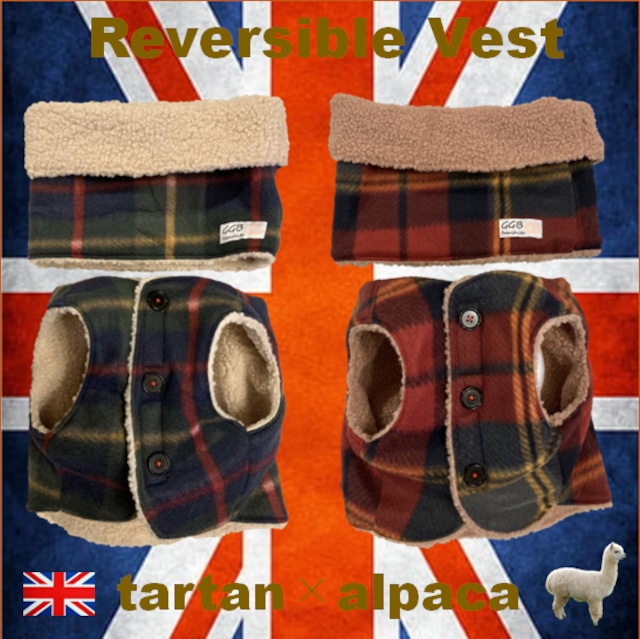 タータンチェック×アルパカボア リバーシブルベスト&スヌード おしゃれ犬服 ハンドメイド ドッグウェア