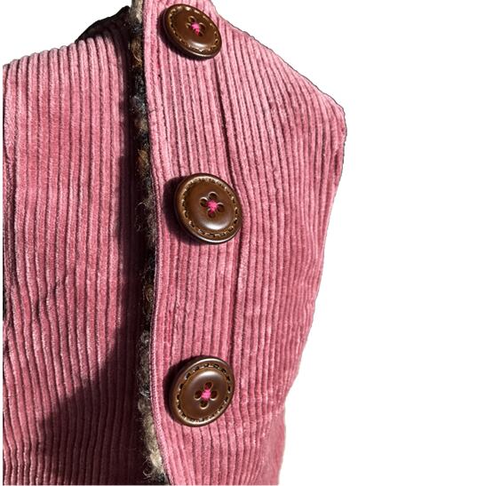 レオパード柄の渦巻ファーと、POPカラーの太コール天が2つ楽しめる✌リバーシブルベストです。どちらも厚めの生地なので防寒対策もバッチリです!マジックテープで前開きになっていますので脱着しやすく、色んなお洋服と重ね着を楽しんでいただけます。