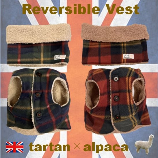 タータンチェック×アルパカボア リバーシブルベスト&スヌード おしゃれ犬服 ハンドメイド ドッグウェア